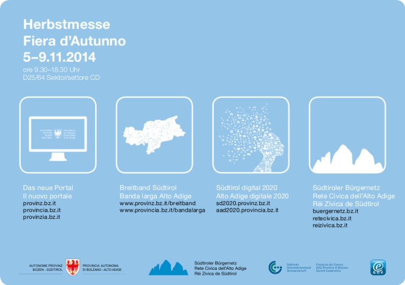 Die Herbstmesse 2014 findet vom 5.-9. November 2014 von 9:30 bis 18:30 Uhr statt. Der Stand des Ressorts Familie und Verwaltung und der Südtirol Informatik AG mit der Nummer D26/64 befindet sich im Sektor CD.