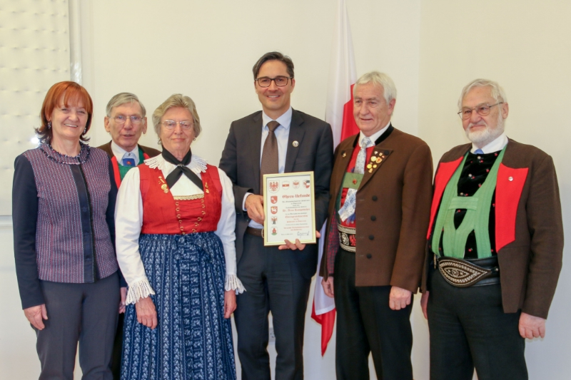 Eine Delegation des Verbandes der Südtiroler in Österreich unter der Leitung von Präsident Helmuth Angermann hat am heutigen Mittwoch (11. März) Landeshauptmann Arno Kompatscher und Landesrätin Martha Stocker getroffen. Dabei wurde dem Landeshauptmann das Ehrenprotektorat des Vereins übergeben.