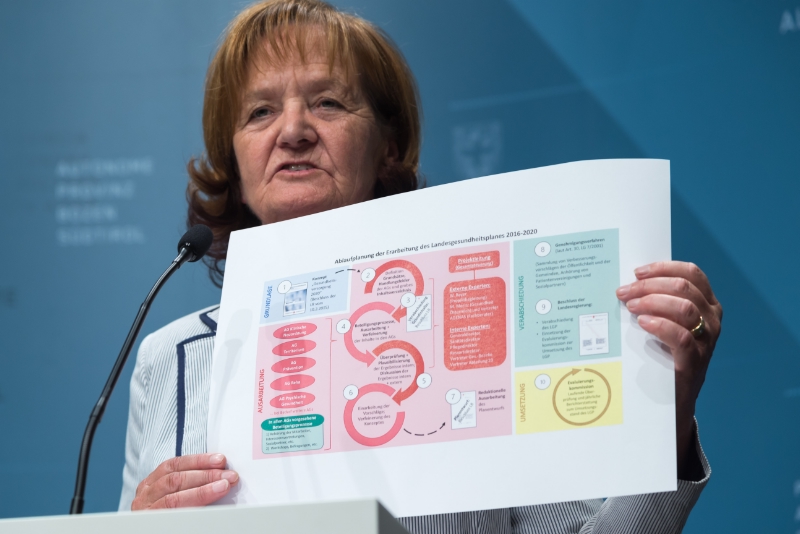 Nach der Verabschiedung des Konzeptes zur Gesundheitsversorgung Südtirol 2020 wird mit dem neuen Landesgesundheitsplan ein wichtiges Steuerungsinstrument für die Ausrichtung der Gesundheitsversorgung in Südtirol erarbeitet. „Der neue Landesgesundheitsplan 2016 – 2020 soll ein strategischer Leitfaden für die Koordinierung und Reorganisation der Dienste und Leistungen zum Schutz, zur Förderung und zur Wiederherstellung der Gesundheit sein“, erklärt Landesrätin Stocker. Mitarbeiter im Gesundheitsbereich, Interessensvertretungen und Sozialpartner, aber auch die Patientenvereinigungen, die Gemeinden und die Öffentlichkeit können sich dabei zu verschiedenen Zeitpunkten in die Ausarbeitung des Leitfadens zur Weiterentwicklung des Gesundheitswesens in Südtirol einbringen. "Der Landesgesundheitsplan wird künftig nicht mehr für einen Zeitraum von drei Jahren, sondern fünf erstellt", so Landesrätin Stocker im Anschluss an die Sitzung der Landesregierung.