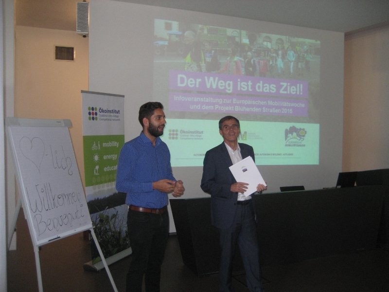 Andreas Pichler, Geschäftsführer vom Ökoinstitut Südtirol/Alto Adige stellte den interessierten Gemeindevertretern das heurige Thema „Der Weg ist das Ziel" vor. Der grenzüberschreitende Wettbewerb „Blühende Straßen" in Zusammenarbeit mit dem Klimabündnis Tirol wurde von Karin Canini von der Landesmobilitätsagentur präsentiert. Bei dieser Aktion soll Straßenraum als Lebensraum umgestaltet werden, wobei der Kreativität keine Grenzen gesetzt sind.