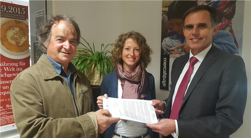 Die Rückmeldungen dazu hat Landesrat Richard Theiner heute (22. April) Brigitte Gritsch, Koordinatorin der Südtiroler Weltläden, und Arno Teutsch, dem Initatior des Projektes "Mahlzeit!", in Bozen überreicht. "Die Ziele des Manifestes wurden von allen Ressorts als sehr positiv bewertet, bestimmte Abteilungen wie im Bereich Bildungswesen oder Gesundheit sind bereits sehr aktiv", erklärte Theiner. Den Anlass für das Treffen bildete der "Internationale Tag der Mutter Erde", der alljährlich am 22. April in über 175 Ländern begangen wird. Er ist im Jahr 2009 auf Vorschlag der bolivianischen Regierung von der Generalversammlung der Vereinten Nationen ausgerufen worden und soll die Wertschätzung für die natürliche Umwelt stärken, aber auch dazu anregen, die Art des Konsumverhaltens zu überdenken.