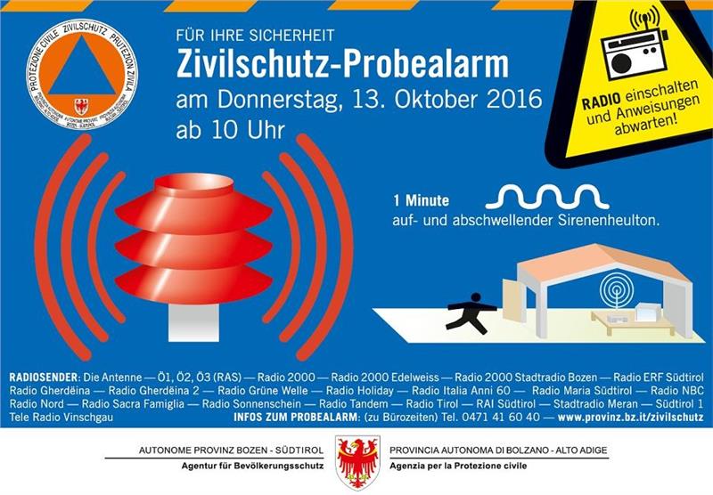 Dieser Zivilschutz-Probealarm läuft am Donnerstag, dem 13. Oktober, um 10.00 Uhr an: Über alle mehr als 500 Sirenen in Südtirol erklingt kurz nach 10.00 Uhr das einheitliche Zivilschutzsignal "Alarm", ein einminütiger auf- und abschwellenden Heulton. Die Landesagentur für Bevölkerungsschutz hat für diesen Probealarm den Internationalen Tag der Katastrophenvorbeugung gewählt. Ab Samstag, 8. Oktober, wird in den Radiosendern auf den Zivilschutz-Probealarm hingewiesen.