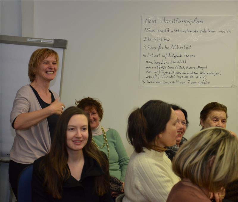 In diesem Sinne erhielten die Teilnehmer der gestrigen Abendveranstaltung „Stil ändern / cambio stile“ in Eppan auch einen kleinen Ratgeber, der sie als Alltagshilfe auf dem Weg zu einem gesunden und aktiven Leben begleiten soll. Der Ratgeber enthält unter anderem einen persönlichen Handlungsplan im Post-it-Format. Wer dies möchte, kann den Kalender nutzen, um für sich selbst erreichbare Ziele für die Änderung der täglichen Gewohnheiten zu stecken und auch gleich die dafür nötigen konkreten Schritte in einem klaren Zeitplan festzulegen. „Der Weg beginnt mit einem ersten Schritt: Wenn dieser erste kleine Schritt ein erfolgreicher ist, so werde ich weit kommen. Deshalb ist es wichtig, die Ziele am Anfang nicht zu hoch zu stecken.“, unterstrichen die Evviva - Kursleiterinnen Sonia Savoi und Bärbel Vonmetz die Wichtigkeit, bei einer Änderung des Lebensstils mit einem Erfolgserlebnis zu starten.