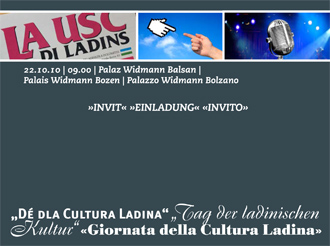 "Minoranze-media-lingua". Questo lo slogan con cui si presenta la Giornata della cultura ladina 2010 in programma per ìl 22 ottobre a Bolzano. La manifestazione, indirizzata soprattutto ai non ladini, che intendono migliorare la conoscenza dei ladini e della loro cultura. L'iniziativa è aperta a tutte le persone interessate.