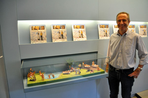 Turisti in accappatoio che si abbronzano sulla sdraio, in piscina e che praticano yoga: all'entrata del Touriseum a Merano sono esposte 19 statuette d´argilla in miniatura per piccoli e grandi visitatori del museo.