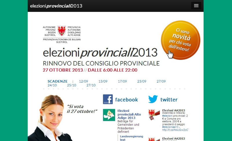 In vista del voto per il rinnovo del Consiglio provinciale il prossimo 27 ottobre la Provincia ha predisposto il link "elezioni provinciali 2013", una facile guida web alle consultazioni provinciali d'autunno. È disponibile in italiano, tedesco e ladino sulle pagine della Rete civica all’indirizzo http://elezioni.provincia.bz.it . Facebook e twitter fanno il loro esordio alle elezioni provinciali.