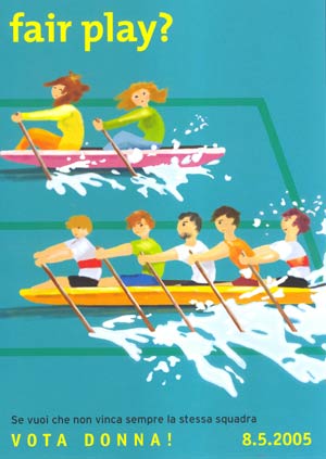 “Poiché la politica è alla fine un contenzioso su come utilizzare le risorse disponibili”, ha spiegato la presidente Unterberger, “il fatto che i rappresentanti dei cittadini siano a tutt’oggi in stragrande maggioranza uomini fa sì che essi destinino queste risorse sulla base delle loro priorità. Un maggior numero di donne nei Consigli comunali avrebbe come effetto una maggiore attenzione alle esigenze femminili”. Effetto finale di questa rivoluzione sui banchi dei Consigli sarebbe un’alternanza tra le priorità maschili e quelle femminili, come in uno scambio veloce al tavolo del ping-pong, rappresentato da una delle immagini della campagna "Vota donna". Le altre due rappresentazioni, sempre ispirate al mondo dello sport e del fair-play che lo dovrebbe caratterizzare, illustrano invece sfide impari tra donne e uomini, e cioè una gara di corsa dove le concorrenti sono appesantite da zaini che contengono “fardelli” legati al lavoro domestico e di cura dei familiari, ed una gara di canottaggio dove la canoa guidata dagli uomini ha un equipaggio molto più consistente di quella delle donne. Le immagini sono riprodotte su 9.000 cartoline, che verranno distribuite nei centri di Bolzano, Merano, Brunico, Bressanone e Vipiteno, e su inserti che verranno pubblicati sui principali quotidiani. È prevista poi la diffusione via radio di spots dedicati al tema del fair play in politica.
