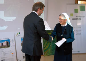 Alla madre superiora del convento, l’assessore all’Ambiente Michl Laimer ed il direttore dell’Ufficio Aria e Rumore Norbert Lantschner hanno consegnato oggi il riconoscimento quale “Migliore CasaClima 2004”. “Nella fase iniziale della progettazione del nostro Vinzenheim”, ha spiegato suor Sieglinde, “non riuscivamo ad immaginare di costruire una casa che divergesse dal solito modo di costruire. Alla fine ci siamo affidate alla competenza dell’architetto. L’occasione di contribuire alla tutela dell’ecosistema, di vivere in un ambiente più sano e di ridurre i costi ci ha affascinato, e siamo rimaste molto soddisfatte del progetto”.