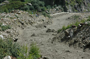 È stato condotto un sopralluogo in particolare nella zona dei ghiacciaio soprastante, dal punto del distacco della frana. Nella parte inferiore gli esperti hanno individuato l'ingresso di una grande caverna ormai crollata - largo una ventina di metri e alto sette - al cui interno lo spazio si era riempito nelle scorse settimane, causa il grande caldo, con l'acqua disciolta del ghiacciaio. "Se sia stata la pressione dell'acqua a provocare il crollo oppure se sia stato un sommovimento naturale a posteriori non possiamo dirlo", spiega Christoph Oberschmied dell'Ufficio Idrografico. Probabile comunque che in un colpo solo diverse migliaia di metri cubi di acqua sono stati liberati trascinando a valle il materiale incontrato nella caduta.