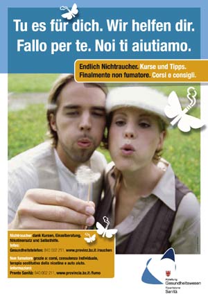 La gamma degli interventi a disposizione di coloro che vogliono abbandonare definitivamente la dipendenza dalla sigaretta spaziano dai colloqui individuali alle terapie di gruppo, dalla somministrazione di appositi farmaci sino all’agopuntura. La campagna informativa promossa in questo ambito dall’Assessorato provinciale alla sanità si avvale del numero verde 840 002211 ed inoltre gli interessati possono avere informazioni complete ed aggiornate consultando il sito della Rete civica: http://www.provinz.bz.it/gesundheitswesen/rauchen/anlaufstellen_i.htm.