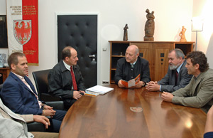 Il dirigente scolastico Waldner (destra) e il responsabile del progetto Lanthaler (sinistra) hanno illustrato al presidente Durnwalder il progetto di solidarietà in RomaniaGrazie all'aiuto proveniente dall'Alto Adige, le popolazioni alluvionate di Iasi, una cittadina rumena nei pressi del confine con la Moldova, hanno potuto realizzare un centro sociale con scuola, asilo e mensa per anziani. Forza trainante di questo progetto di cooperazione allo sviluppo sono stati gli studenti della scuola professionale provinciale di Silandro, guidati dal responsabile Peter Lanthaler. Molti studenti e professori si sono impegnati direttamente nella costruzione degli edifici in Romania, contribuendo anche alla raccolta di generi alimentari e di prima necessità da donare alle popolazioni colpite dall'alluvione. Il progetto di solidarietà è stato finanziato dalla Provincia Autonoma di Bolzano e dalla Regione Trentino Alto Adige.