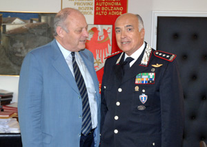La collaborazione, nei vari ambiti, tra l'Amministrazione provinciale e l'Arma dei Carabinieri in Alto Adige è stata discussa nell'incontro di oggi (6 ottobre) a Bolzano tra il presidente della Provincia Luis Durnwalder e il generale Libero Lo Sardo, Comandante interregionale dell'Arma dei Carabinieri per il Nordest.