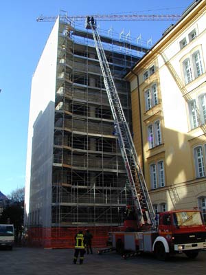 I responsabili dei vigili del fuoco Ernst Preyer e Walter Depaoli, il responsabile di progetto Hans Peter Santer e il gruppo dei progettisti della "Kerschbaumer&Pichler" hanno verificato da vicino quali misure edilizie siano necessarie in dettaglio per attrezzare il sesto piano dell'immobile di testa, dove verranno insediati i locali di svago per gli studenti, contro eventuali emergenze e consentire tra l'altro un intervento agevole della scala girevole. "Condurre questi test anticendio nella fase di costruzione di edifici complessi è di grande importanza - spiega l'assessore Mussner - per prevenire eventuali problemi legati alla tutela delle persone nei casi di incendio, uno degli aspetti centrali dell'attività dell'Assessorato ai Lavori pubblici."