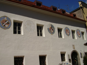Si tratta di cinque affreschi che raffigurano gli stemmi di cinque abati dell'Abbazia di Novacella, che si sono succeduti alla guida dell'Abbazia tra il 1721 ed il 1787, che decoravano quella che fu la sede amministrativa del convento agostiniano, "Neustifter Amtshaus", e che raccontano una sorta di storia della proprietà.