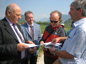 La prima tappa della giornata, per la delegazione composta dal presidente Luis Durnwalder e dal direttore della Ripartizione opere idrauliche Rudolf Pollinger, è stata Termeno. Qui, lungo l’argine orografico destro del fiume Adige, poco sopra il ponte di Egna, sono in corso i lavori di costruzione di un rinforzo per rendere più sicura tutta la zona. È ancora forte, infatti, il ricordo dell’alluvione del luglio 1981 in Bassa Atesina, con l’esondazione dell’Adige che provocò ingenti danni. "Per evitare il ripetersi di questi eventi catastrofici – ha commentato il presidente Durnwalder – la Provincia si sta impegnando da anni con numerosi interventi di rinforzo degli argini destro e sinistro dell’Adige. Il nostro obiettivo è quello di rendere più sicuro tutto il corso del fiume in una zona particolarmente esposta ai rischi di alluvione". Nel caso specifico di Termeno, verranno rafforzati circa 500 metri di argine, in modo tale che l’argine stesso abbia ovunque un’altezza maggiore di 3 metri rispetto al livello della campagna. "Così facendo – prosegue Durnwalder – potremmo creare anche una corsia riservata ai mezzi di soccorso, che, in caso di pericolo, potranno raggiungere più velocemente i tratti dove si rendono necessari gli interventi".