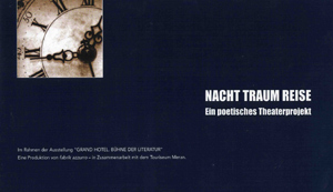 La serata con Torsten Schilling ed il suo gruppo teatrale "fabrik azzurro" con lo spettacolo "Nacht Traum Reise - teatro in hotel" presso l'Hotel Castel Fragsburg rientra nel "Literatour“ il programma di contorno all'esposizione allestita al Touriseums "Grand Hotel. Palcoscenico per letterati".
