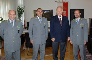 La collaborazione tra Amministrazione provinciale e Guardia di finanza in vari settori, la bilinguità nel servizio pubblico e il problema degli alloggi per il personale sono stati i temi discussi nell'incontro a Bolzano tra il presidente della Provincia Luis Durnwalder e i vertici della Guardia di Finanza. L’occasione è stata offerta dalla visita di commiato compiuta oggi (18 settembre) a Palazzo Widmann dal tenente colonnello Domenico Fornabaio, che lascia il comando provinciale di Bolzano. Presenti all’incontro anche il generale Giorgio Bartoletti, comandante regionale della Guardia di Finanza, e il tenente colonnello Claudio Di Gregorio, nuovo comandante provinciale delle Fiamme gialle.