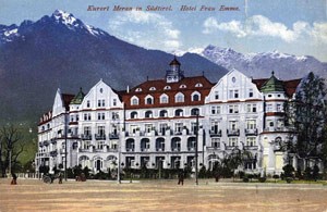 Fin dal suo faticoso decollo turistico, infatti, Merano aveva attirato a sé numerosi imprenditori ebrei che aprirono alberghi di lusso, pensioni, sanatori, ristoranti kasher e negozi. Moltissimi furono i medici ebrei che allestirono i loro ambulatori specialistici e sempre più numerosi si fecero i turisti di cura che vi trovarono anche le strutture necessarie ad una vita ebraica. Letterati, intellettuali, scrittori e uomini di scienza ebrei si incontrarono quindi nelle sale da pranzo e nelle accoglienti hall dei grandi alberghi meranesi, passeggiarono fra parchi e giardini sotto la Wandelhalle e ovviamente sulle Passeggiate Lungopassirio: il poeta berlinese Paul Heyse che giunse in città nel settembre del 1861, il romanziere e pubblicista Perez Schmolenskin, uno dei massimi esponenti dell’Haskalà ebraica, che approdò a Merano nel dicembre del 1884, Arthur Schnitzler che nel 1886 trascorse in città il suo secondo soggiorno e le mura del Tyrolerhof furono le mute testimoni del suo incontro con Olga Waissnix. Il maniero di Labers fu la dimora suggestiva scelta da Stefan Zweig, mentre Kafka, giunto a Merano nella primavera del 1920, trascorse un primo periodo presso il Grand Hotel Emma per poi trasferirsi alla Pension Ottoburg.