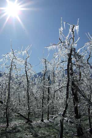 Nel mese di marzo per prevenire i danni da gelo alle piante da frutto in piena fioritura sono stati utilizzati gli impianti d'irrigazione a pioggia. L'acqua quando si tramuta in ghiaccio produce circa 80 chilocalorie al litro, ovvero 335 Joule per grammo di acqua gelata; una parte del calore sviluppato protegge le gemme ed i boccioli. Il riscaldamento necessario per evitare che il gelo distrugga la fioritura è garantito fintanto che l'acqua dell'irrigazione continua a cadere. Per tale ragione gli impianti d'irrigazione vengono tenuti in funzione fino all'alzata del sole quando la temperatura sale oltre gli 0 gradi Celsius. Questo metodo di protezione è il più vantaggioso dal putno di vista dei costi e della sostenibilità ambientale, così Peterlin.
