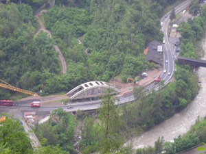 Il nuovo tratto di Statale a Steg presenta due corsie da 3,5 m e banchine da 75cm oltre che gli allargamenti dovuti in curva. Il ponte, lungo 35 metri, è realizzato con travi in acciaio.