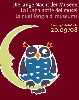 Torna anche quest'anno, dopo i successi delle passate edizioni, la "lunga notte dei musei". 27 musei altoatesini, esclusi quelli di Bolzano, che organizzano una propria "notte" il 28 novembre, apriranno i battenti anche di sera per presentare i propri tesori in un'atmosfera suggestiva. L'appuntamento è per sabato 20 settembre.