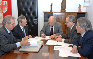 A Palazzo Widmann è stato siglato oggi, con la firma del presidente Luis Durnwalder e del presidente Michl Ebner, il patto di stabilità tra la Provincia e la Camera di Commercio, secondo lo schema predisposto dalle Ripartizioni provinciali Finanze e Enti locali. Prevede per il 2009 una lieve riduzione (lo 0,6%) delle spese di investimento e delle spese correnti dell'ente camerale: le voci di spesa che ricadono entro il patto di stabilità scendono dai 21,72 milioni € del 2008 ai 21,58 milioni € del prossimo anno. Sono invece esclusi dal patto di stabilità i costi sostenuti per EOS, l'organizzazione che promuove l'export, e per l'Ipse, l'istituto che promuove lo sviluppo economico.