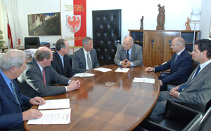 Guidati da Helmuth Innerbichler, presidente del SWR, l'unione che raggruppa il mondo economico di lingua tedesca, a Palazzo Widmann i presidenti delle categorie economiche locali (artigianato, commercio, imprenditoria industriale, agricoltura, alberghiero) hanno incontrato il presidente Durnwalder, che ha voluto approfondire con le categorie interessate gli interventi a favore del mondo economico messi in cantiere nel biennio dalla Giunta provinciale per fronteggiare adeguatamente la recessione economica. Il Presidente ha discusso un eventuale adeguamento del sistema di valutazione del capitale proprio dell’azienda da parte delle banche, il ricorso ai contributi concessi dalle cooperative di garanzia quali interventi compensativi, un allungamento di cinque anni del fondo di rotazione in presenza di piani di risanamento aziendali. Il governatore ha poi confermato che nel 2010 i consorzi di garanzia fidi saranno accorpati in un’unica istituzione comprendente anche quelli dei settori turismo e agricoltura.