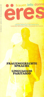 Il nuovo numero di “ëres-frauen info donne” edito dal Comitato provinciale per le pari opportunità si sofferma primariamente sul tema del linguagio non sessista per giungere ad una società paritaria; in Alto Adige sono stati fatti passi avanti in questa direzione benché, come viene riferito, sul fronte della lingua italiana si registri un arretramento rispetto agl ambiti di lingua tedesca e ladina.