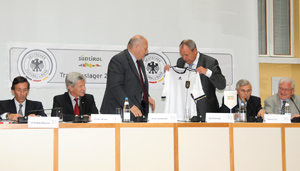 Dal 21 maggio al 2 giugno la nazionale tedesca di calcio sarà in ritiro a Cornaiano prima di volare ai Mondiali in Sudafrica. I dettagli sullo svolgimento del ritiro della Germania e tutte le informazioni sul piano organizzativo sono stati forniti oggi (4 maggio) a Bolzano nella presentazione con il presidente della Provincia Luis Durnwalder, gli assessori Hans Berger e Thomas Widmann, il direttore comunicazione della nazionale tedesca Harald Stenger, che ha donato a Durnwalder la maglia numero 10 della nazionale.