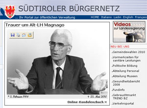 All’indirizzo della rete civica www.provincia.bz.it sono giunti sinora oltre 150 messaggi di condoglianze dedicati all’ex presidente della Provincia, Silvius Magnago. Si tratta di messaggi scritti da cittadini altoatesini, ma provenienti anche dall’Austria, dalla Germania e dalle altre regioni italiane.