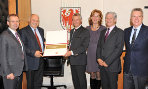 Per la seconda volta, dopo il 2008, la Giunta provinciale ha assegnato il Grande ordine di merito, la massima onorificienza istituzionale a livello locale. Il riconoscimento è stato attribuito a 12 personalità non residenti in Alto Adige che nei rispettivi ambiti di lavoro – dalla politica alla cultura, dall'arte all'amministrazione – hanno contribuito allo sviluppo della nostra terra. La cerimonia ufficiale, svoltasi il 5 settembre a Castel Tirolo, ha avuto un'appendice quest'oggi (3 novembre) a Palazzo Widmann: il presidente Luis Durnwalder, accompagnato dal vicepresidente Hans Berger, e dagli assessori Sabina Kasslatter Mur, Michl Laimer e Roberto Bizzo, ha infatti consegnato il Grande ordine di merito all'ex direttore della Bayerischen Rundfunk (BR), Thomas Gruber. "La nostra autonomia – ha spiegato il presidente Luis Durnwalder – è frutto del grande lavoro di molte personalità di alto profilo. I padri dell'autonomia si trovano in Alto Adige, ma anche in Austria, in Germania e nelle forze democratiche italiane. Li vogliamo ringraziare con questa onorificenza. Non si tratta solo di una medaglia, è molto di più: è il simbolico grazie di tutta la popolazione locale".
