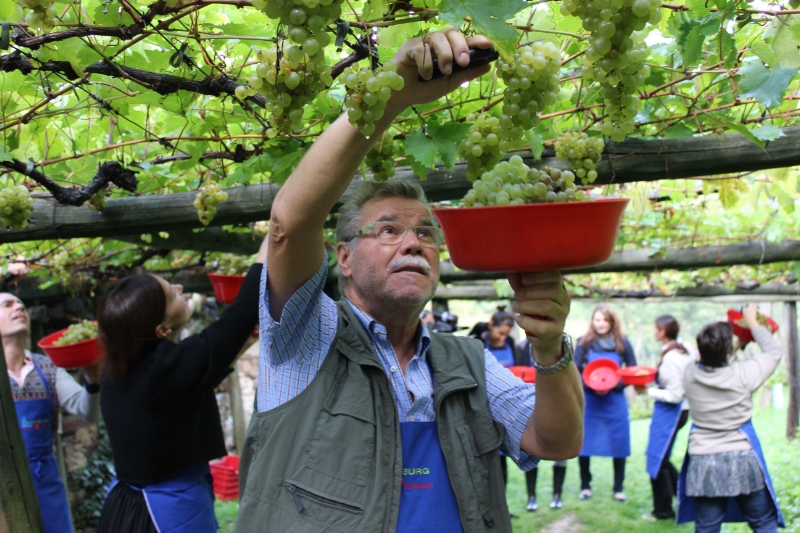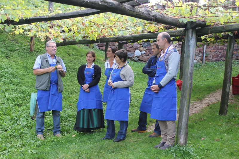 Tutti gli invitati, fra cui anche Hannes Waldmüller, direttore del Consorzio per la tutela dei vini dell'Alto Adige, Thomas Aichner, direttore della Merano Marketing (MGM), e i rappresentanti della stampa locale hanno partecipato alla vendemmia. Dopo una visita attraverso Castel Katzenzungen, è stato degustato il vino "antico" e altre varietà autoctone dell'Alto Adige.