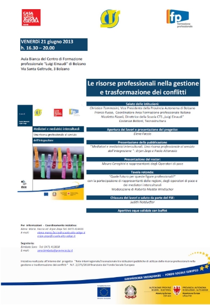 Il progetto "Rete interregionale/transnazionale tra istituzioni pubbliche di utilizzo delle risorse professionali nella gestione e trasformazione dei conflitti", finanziato dal Fondo Sociale Europeo, ha fornito l'opportunità di avviare una riflessione sullo "stato dell'arte" della mediazione interculturale in provincia di Bolzano.