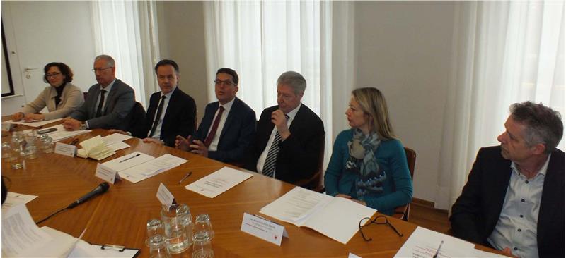 da sx: Patrizia Zomer (direttrice Ripartizione Edilizia abitativa ad interim), Paolo MOntagner (direttore Dipartimento Edilizia e Lavori pubblici), per l'IPES, Wilhelm Palfrader (direttore generale), Heiner Schweigkofler (presidente), Renzo Caramaschi (vice-presidente), Manuela Paulmichl (membro CdA), Gianfranco Minotti (vice-direttore generale)