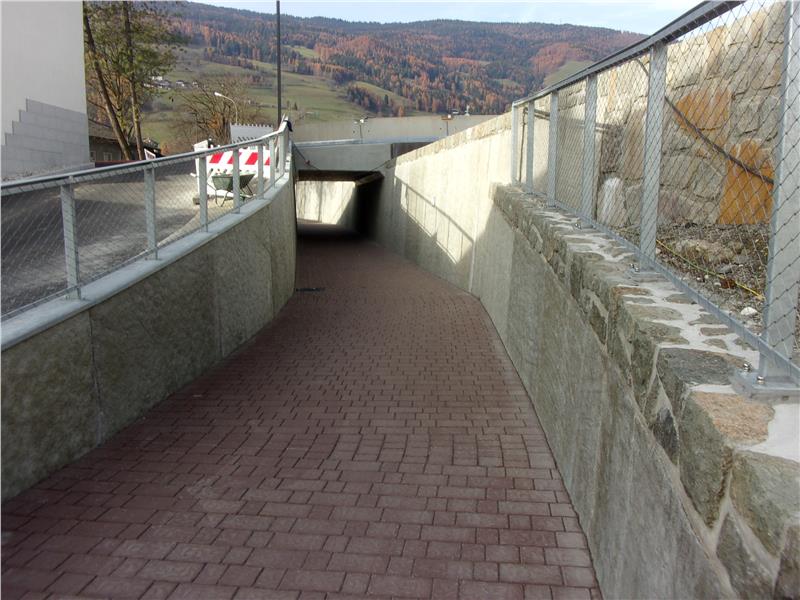 Il terzo lotto dell’intervento prevede la realizzazione di un sottopassaggio nelle vicinanze del nuovo ponte, per fornire a pedoni e ciclisti un collegamento sicuro fra il centro, la zona sportiva e la stazione dei treni. Attualmente sono in corso gli ultimi lavori di montaggio sull’area del ponte, nonché lavori di sistemazione nel piccolo parco nei pressi del semaforo. Particolarmente complessa si è rivelata nella prima parte dell’anno la prosecuzione dei lavori a causa del poco spazio a disposizione e dell’impossibilità di deviare il corso dell’Isarco. Notevole anche l’impegno per la regolamentazione del traffico nella zona e per lo spostamento di diverse linee elettriche interrate esistenti. Molta attenzione è stata dedicata nel corso dell’intervento alla qualità del lavoro, portato avanti da una squadra di artigiani specializzati guidati Otto Gruber dell’Ufficio bacini montani nord.