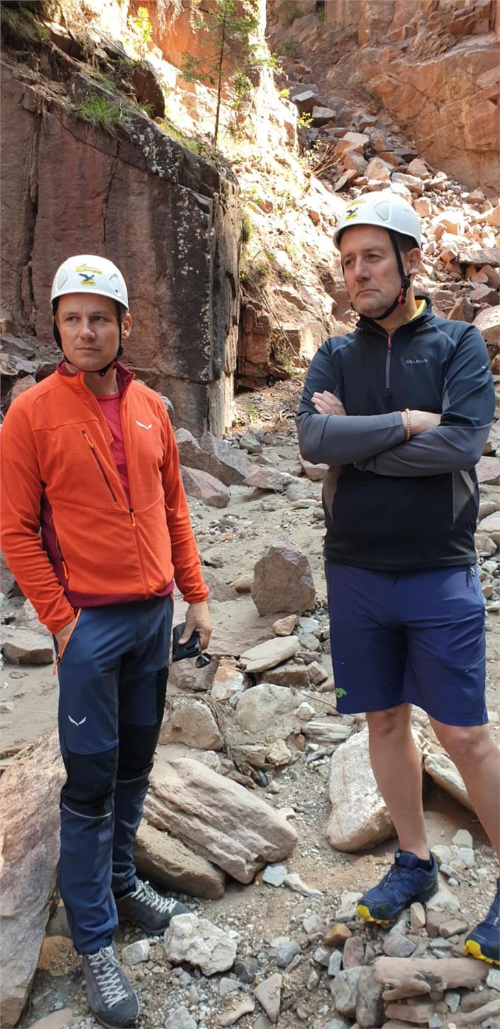 Nel corso della visita l’assessore Bessone ha potuto verificare di persona gli esiti dell’intervento di messa in sicurezza di un costone di porfido del canyon Bletterbach eseguito dai geologi dell’Ufficio geologia e prove materiali a fine giugno. I geologi provinciali eseguono controlli periodici della sicurezza del canyon. Già nel maggio 2018 al costone in questione, che presentava evidenti fessure, erano stati apposti degli estensimetri, apparecchiature apposite per monitorare i movimenti delle rocce. Nei mesi di maggio e giungo di quest’anno i dispositivi avevano evidenziato un’accelerazione esponenziale dello spostamento. A fine giugno l’intervento urgente coordinato dall’Ufficio geologia e prove materiali ha portato al brillamento del versante, programmato ed eseguito dal geologo Giacomo Nardin, e al disgaggio delle rocce pericolanti, effettuato dalla ditta Locher, per circa 200 metri cubi di materiale. In tal modo è stato reso nuovamente sicuro e percorribile ai numerosi visitatori un tratto suggestivo del canyon. Nell’operazione hanno collaborato anche il personale del Geoparc e le guardie forestali nel sorvegliare l’area durante l’intervento e nell’informare gli escursionisti.