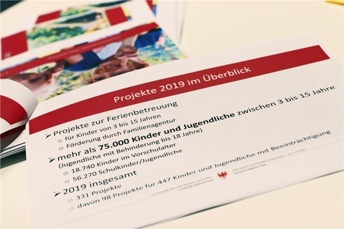 Lo Jugenddienst Bozen-Land ha svolto a tal proposito una ricerca online, dalla quale emerge che i progetti estivi sono importanti sia per le famiglie che per la comunità nel suo complesso, anche grazie ai valori messi in campo dagli organizzatori dei progetti ispirati in primo luogo al benessere dei bambini e dei giovani, alla soddisfazione dei genitori e per questo vengono coinvolti assistenti particolarmente preparati e motivati. La collaboratrice del Jugenddienst Bozen-Land, Jasmin Saltuari, ha sottolineato che "prima di avviare un progetto gli operatori seguono un corso di formazione di alcuni giorni durante il quale vengono trattate tematiche con la gestione dei conflitti o le principali tecniche di pronto soccorso". La presidente del Jugenddienst Bozen-Land, Barbara Wild, ha quindi sottolineato che il successo di queste iniziative va ascritto in primo luogo alla buona collaborazione tra i Comuni e l’Agenzia per la famiglia.