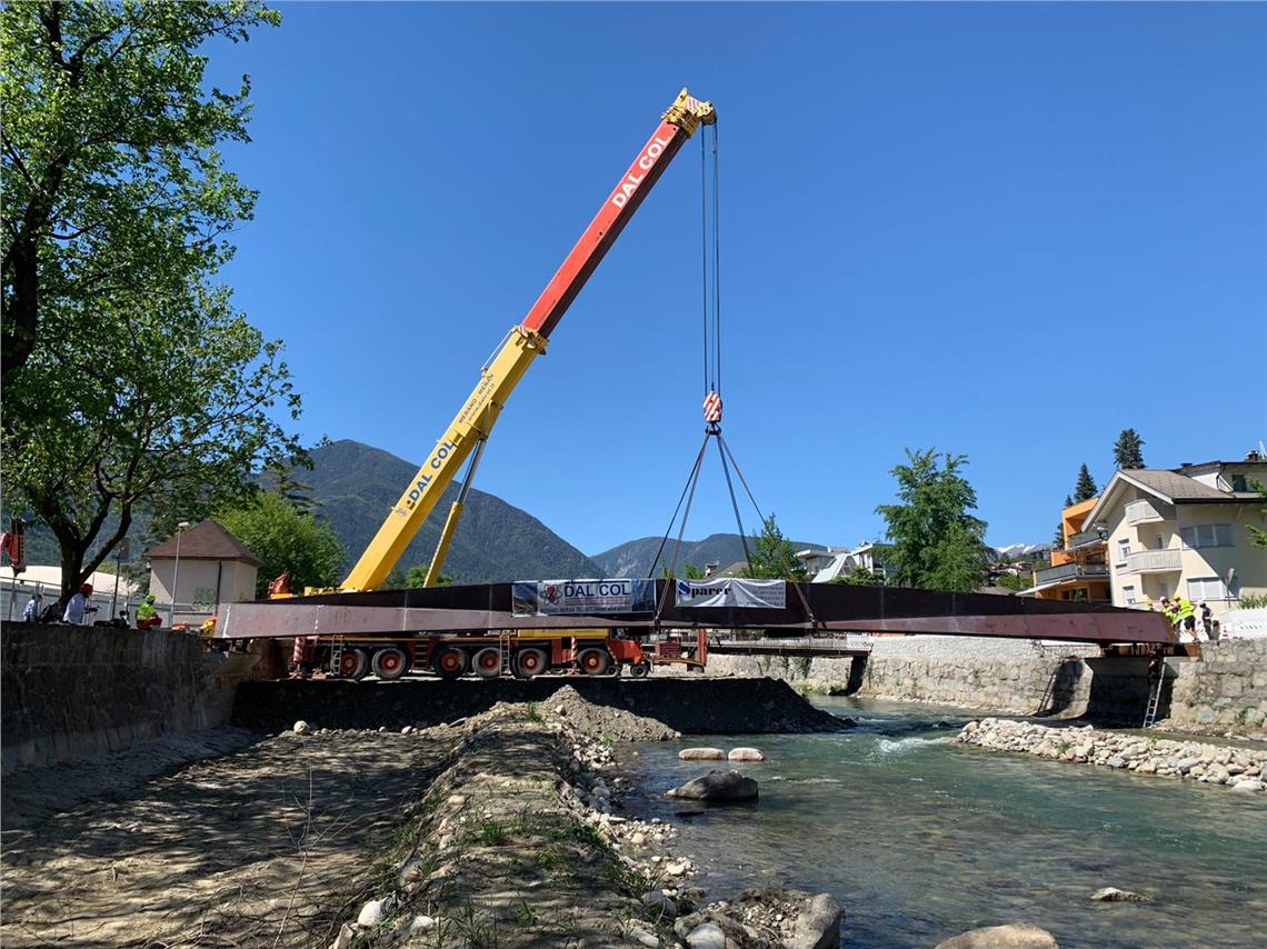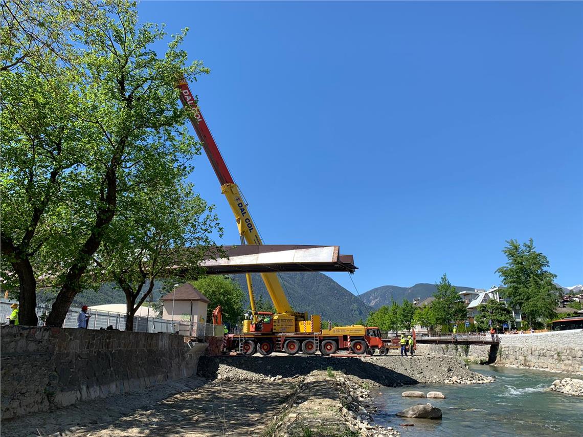 Posata oggi (7 maggio) la nuova passerella ciclopedonale sull'Isarco. I lavori sul fiume serviranno a mettere in sicurezza Bressanone dalle piene.