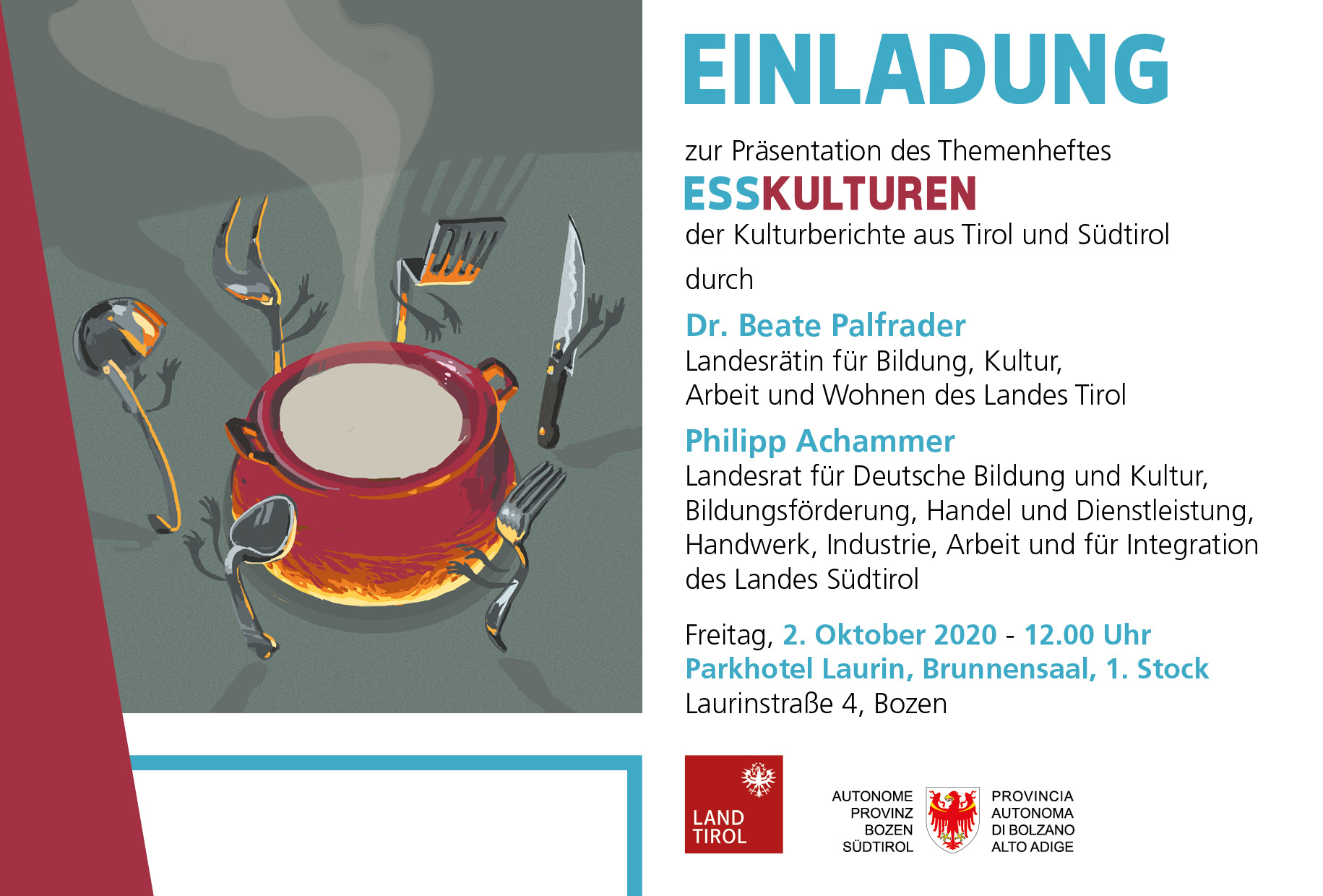 La cultura del cibo è il tema centrale dei Kulturberichte 2020. Il numero tematico coordinato da Sylvia Hofer e Petra Streng getta uno sguardo sulla varietà della "Esskultur" a nord e a sud del Brenero con una serie di contributi di autori e autrici che sviscerano il tema da diverse angolature. Il numero dei Kulturberichte viene presentato