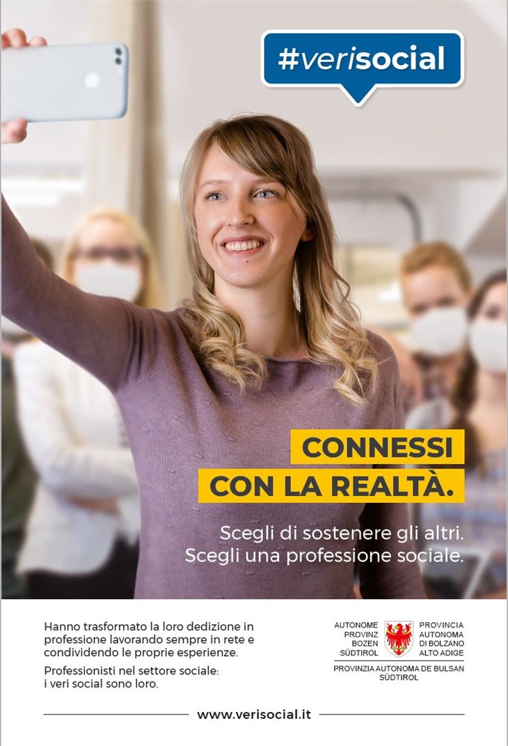 La campagna #verisocial, che è stata avviata da alcuni giorni, si propone di sensibilizzare l’opinione pubblica in merito all’importanza delle professioni sociali. Da un lato si vuole evidenziare le opportunità occupazionali offerte da questo settore anche per il futuro e dall’altro vengono sottolineate la professionalità e le molteplici figure professionali di questo settore. Nell’ambito della campagna due donne e due uomini, che nella vita reale svolgono varie professioni sociali come operatori socio assistenziali o socio sanitari, assistenti sociali o educatori sociali, descrivono la loro attività e l’ambito in cui lavorano. Parallelamente nella pagina web www.verisocial.it si possono trovare preziose informazioni riguardo ai diversi profili professionali ed alle opportunità formative esistenti a livello provinciale.