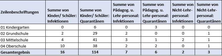 Nelle scuole dell'infanzia non sono stati registrati casi, nelle scuole primarie (scuole elementari) vi sono stati 4 casi di positività al Covid-19, due tra il personale docente e due tra i bambini, nelle scuole medie sono stati registrati nove casi (4 tra i ragazzi), mentre vi sono stati 12 casi (10 fra i ragazzi) nelle scuole secondarie di secondo grado (scuole superiori) compresa la formazione professionale.