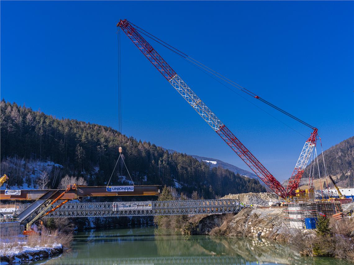 Iniziato il montaggio delle travi più lunghe del ponte sul lago artificiale del Kniepass che consentirà di realizzare il nuovo accesso per la val Badia a San Lorenzo. Sopralluogo di Alfreider.