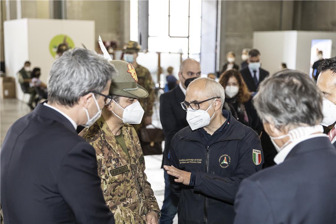Il commissario all'emergenza Covid-19 Figliuolo e il capo della Protezione civile nazionale Curcio accompagnati dal presidente della Provincia Kompatscher al centro vaccinale di Bolzano.