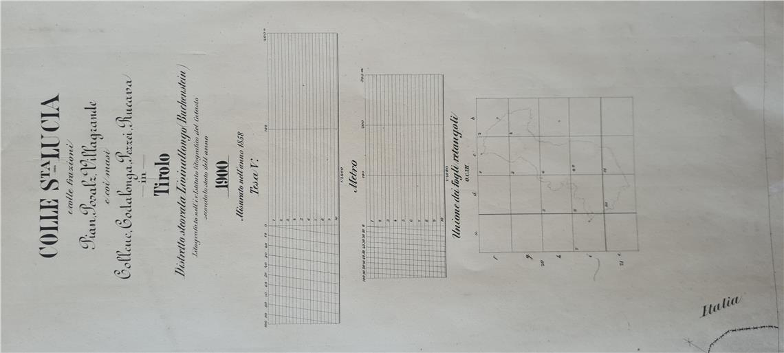 Martedì 1° maggio, presso l’archivio della Corte d’Appello di Trento, sono state ritrovate le mappe storiche del Comune ladino Colle Santa Lucia (Versail in tedesco), il quale – assieme a Cortina d’Ampezzo e Livinallongo – fa parte oggi della provincia di Belluno. Durante l’Impero Austro-Ungarico Colle Santa Lucia era di competenza della circoscrizione giudiziaria di Bressanone, ma con la fine della prima Guerra Mondiale il Comune venne formalmente annesso al Regno d’Italia. L’attività di rilevamento topografica è stata effettuata nel 1858, mentre la restituzione cartografica risale al XX secolo.