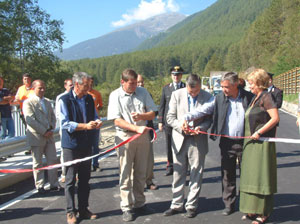 Il taglio del nastro da parte dell'assessore Mussner"Questo nuovo ponte - ha spiegato Mussner - non permette solamente di attraversare il Rio Ram, ma rappresenta una parte importante del collegamento con la Svizzera. I tempi di consegna sono stati rispettati, e nel costruirlo è stato risparmiato il 10% della cifra prevista. In futuro questa somma potrà essere destinata ad altri lavori". Il nuovo ponte La Calva si trova nel territorio comunale di Malles, misura 18,5 metri, ed è stato realizzato dall'impresa "Wallnöfer Walters Erben" di Glorenza. I lavori si erano resi necessari in quanto il vecchio ponte sul Rio Ram denotava problemi di tenuta. Durante i lavori il traffico è stato deviato attraverso un ponte provvisorio realizzato con legno e cemento.