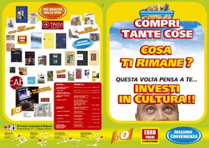 Un volantino simile a quelli delle offerte dei supermercati, ma dedicato al consumo di cultura. È il singolare messaggio che la Ripartizione provinciale Cultura italiana ha inviato per posta agli altoatesini. 65.000 buche delle lettere, 4 comuni, 63.000 famiglie, 140.000 persone: questi i numeri dell’ultima campagna di comunicazione sociale della Ripartizione.