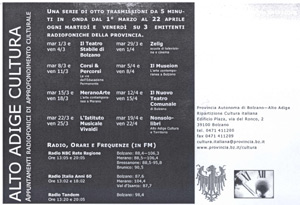 Gli appuntamenti radiofonici si aprono il primo marzo con la puntata dedicata al Teatro Stabile di Bolzano, a cui seguiranno nell'ordine quelle dedicate a: Corsi & Percorsi-le vie dell'educazione permanente, KunstMeranoArte, l'Istituto musicale "Antonio Vivaldi", Zelig-scuola di televisione e cinema, il Museion, il Nuovo teatro Comunale, Nonsololibri-Alto Adige Cultura e Territorio. Quasi tutti gli speciali contengono una intervista ad un personaggio di rilievo della struttura presentata.