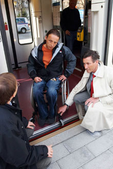 Um dieses Hindernis aus dem Weg zu räumen, wurden nun an allen Bahnsteigen zehn Zentimeter breite Holzprofile befestigt, die den Spalt auf neun Zentimeter verringern. "Ein solcher Spalt ist auch für die motorisierten Rollstühle problemlos zu überwinden", so Widmann. Die neuen Zustiege getestet hat bereits Martin Telser von der Sozialgenossenschaft "independent L", auf deren Ersuchen hin der Spalt zwischen Bahnsteig und Zug geschlossen worden ist. "Wir haben den Vertretern der Menschen mit Behinderung versprochen, diese Hürde aus dem Weg zu räumen und dieses Versprechen selbstverständlich auch gehalten", so Widmann.