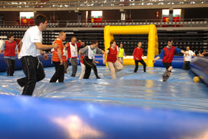 Im Mittelpunkt des Geschehens stand in diesem Jahr der Fußball. Durchaus nicht umsonst, stehen doch die Europameisterschaften vor der Tür. Ein Turnier gab's deshalb auch in der Eiswelle, und zwar eines auf einem aufblasbaren Fußballfeld, auf dem sich die Mannschaften unterschiedlicher Betreuungsstrukturen mit viel Einsatz, Herz und Spaß geschlagen haben. Die Ehre, die Sieger zu prämieren, hatte am frühen Nachmittag Soziallandesrat Theiner, der den Siegerpokal an die Mannschaft einer Sozialgenossenschaft aus Cles überreichen konnte. Platz zwei sicherte sich die Mannschaft der Genossenschaft werktätiger Behinderter aus Bozen, während Platz drei an die Mannschaften der Seeburg in Brixen und der Behindertenwerkstatt Wiedeneck in Toblach ging.