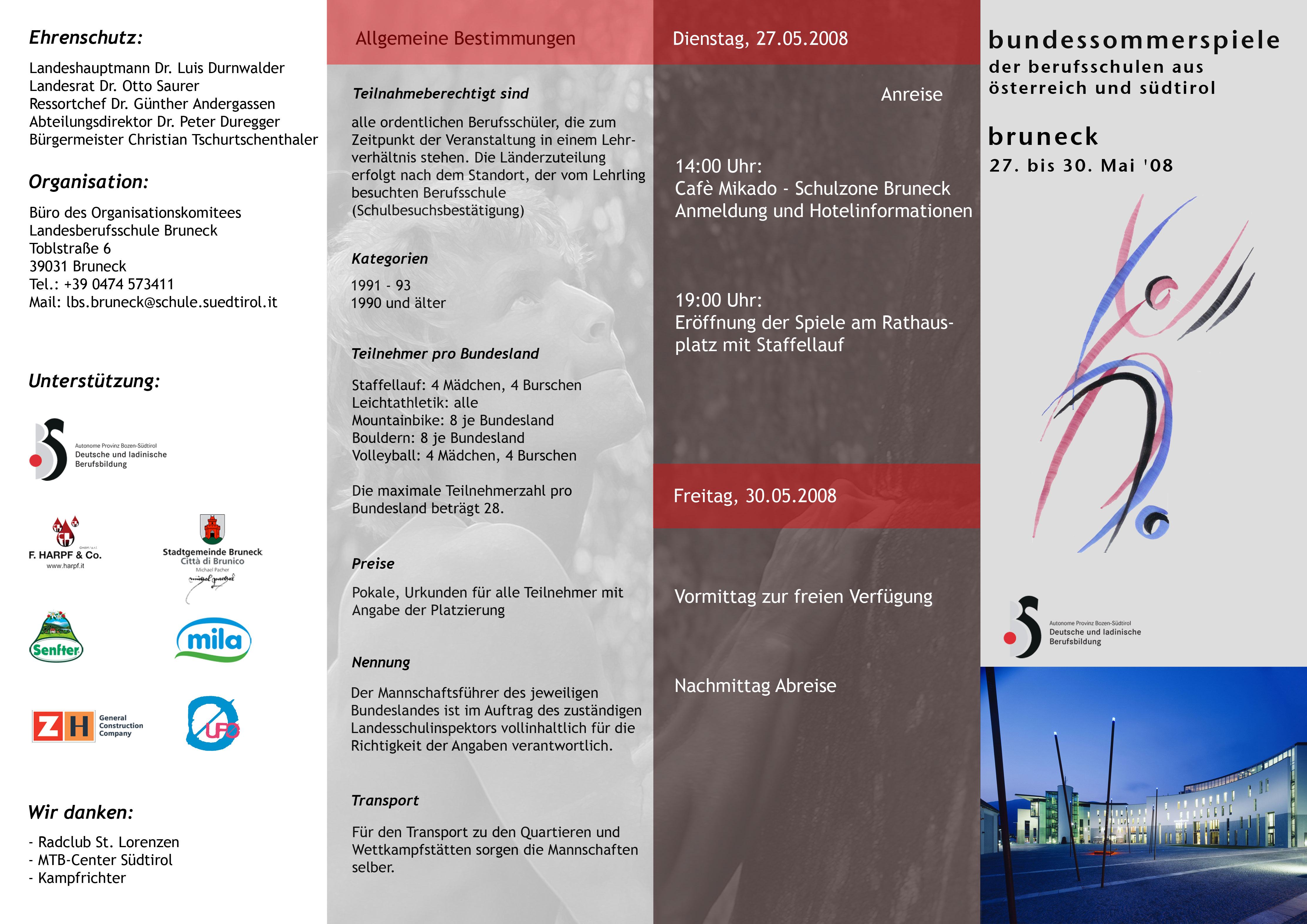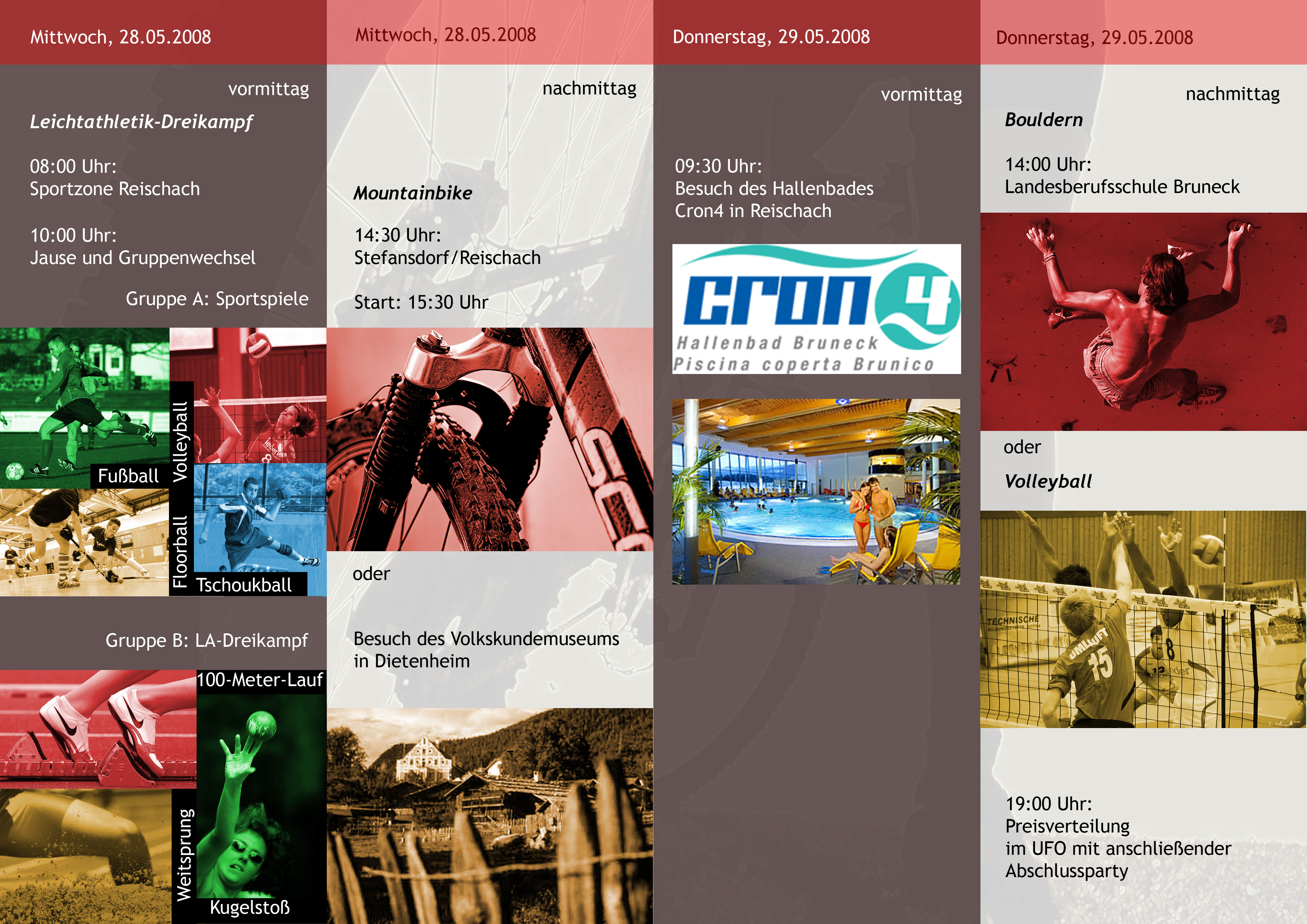 Am Mittwoch, 28. Mai, stehen zwischen 8 und 12 Uhr in Reischach die Leichtathletik-Wettkämpfe auf dem Programm. Zwischen 14 und 17 Uhr werden in Stefansdorf die Mountainbike-Rennen ausgetragen. Am Donnerstag, 29. Mai steht zwischen 14 und 18 Uhr das Sportklettern (Bouldern) im Schulhof LBS Bruneck auf dem Programm. Mit dem Volleyballturnier wird der sportliche Teil beendet. Die Abschlussfeier steigt um 19 Uhr im UFO Bruneck.